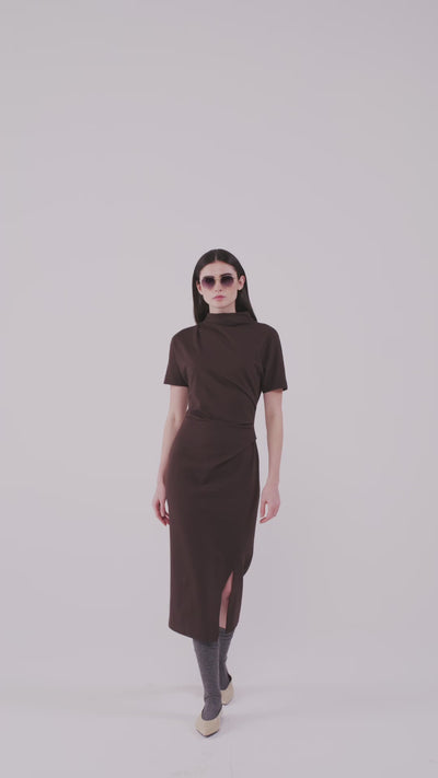 Questo abito longuette con spacco combina un design sofisticato con dettagli funzionali come le maniche corte e il collo alto. La linea slanciata valorizza la silhouette, mentre lo spacco aggiunge un tocco di eleganza e movimento, rendendolo perfetto per occasioni formali o eventi serali.