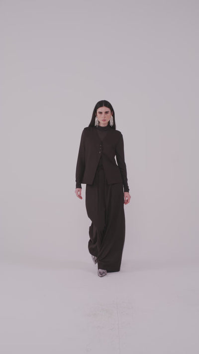 Il pantalone largo fluido offre una vestibilità ampia e avvolgente, ideale per garantire comfort without rinunciare a un look sofisticato. La stoffa scivola sul corpo valorizzandone i movimenti, rendendolo perfetto sia per ambienti formali che casual. La sua versatilità lo rende un capo chiave per creare outfit eleganti e moderni con facilità.